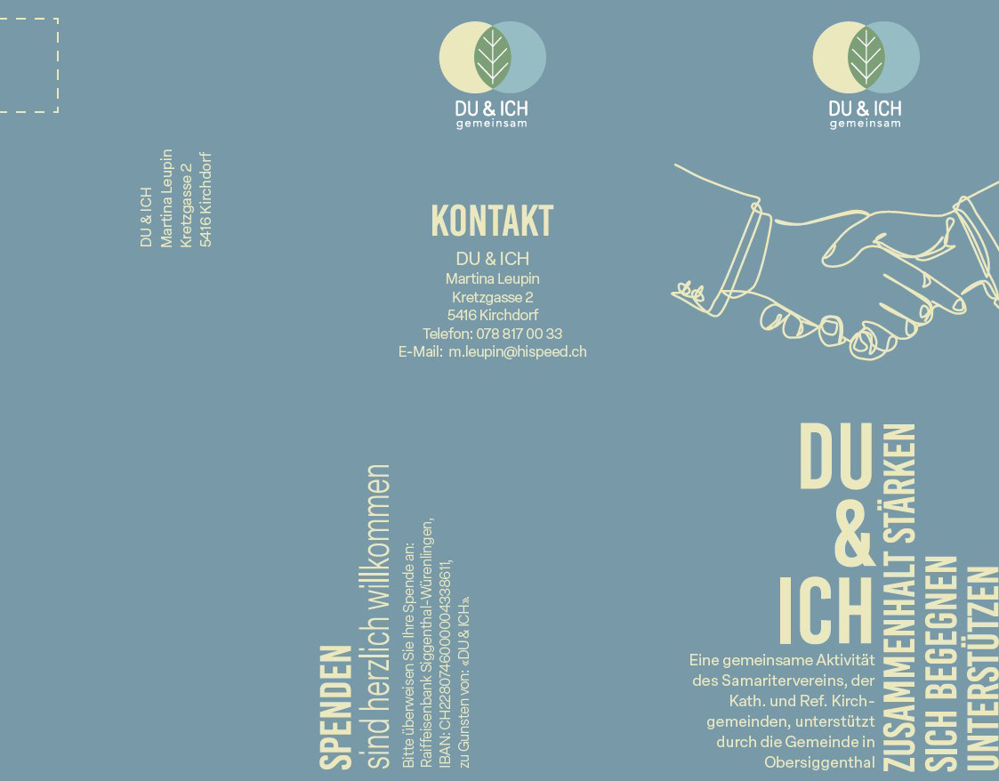 DU & ICH ist ein gemeinsames Projekt des Samaritervereins und der kath. und ref. Kirchgemeinden in Obersiggenthal AG. DU & ICH vermittelt regelmässige Besuche und fördert damit den Zusammenhalt zwischen den Generationen. Das Projekt wurde neu aufgenommen und benötigte ein neues Logo und einen Flyer mit Anmeldetalon. Für eine Gewerbe-Ausstellung der Gemeinde benötigte DU&ICH ein Roll-up Display.